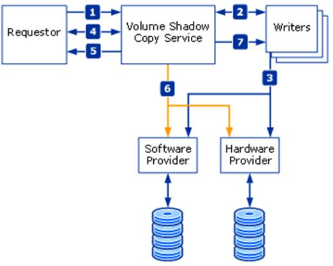 Det er en service som laver snapshots af data i real tid og som har standard support til at lave kontinuerlige kopier over flere volumes. VSS kordiner shadow copy til at lave kontinuerlige bakcups (det er også kendt som snapshot eller point-in-time-copy.) |