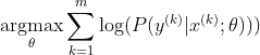 The most popular method to train a neural network is Maximum Likelihood Estimation. We estimate the parameters theta in a way that maximizes the likelihood of the training data (of size m). Because the likelihood of the whole training dataset is a product of the likelihoods of each sample, it is easier to maximize the log-likelihood of the dataset and thus the sum of the log-likelihood of each sample indexed by k: