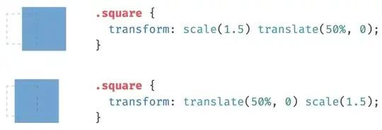 first establishes a new coordinate system 500px along the X axis (to the right) of its parent, and only then, within that (translated, but it's now irrelevant) coordinate system does it perform the rotation. So it'll be a shape that's 500px to the right, and rotated in place (around the so-called transform-origin which is interpreted in the local coordinate system, and the default 50% 50% for rotation means, rotation around the center of the rectangle, but it's an aside).