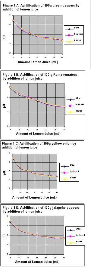 Lemon juice acidification curves were created for sweet green peppers, Roma tomatoes,