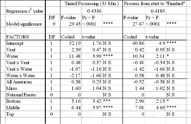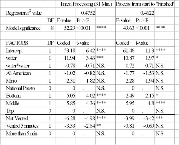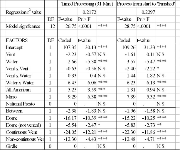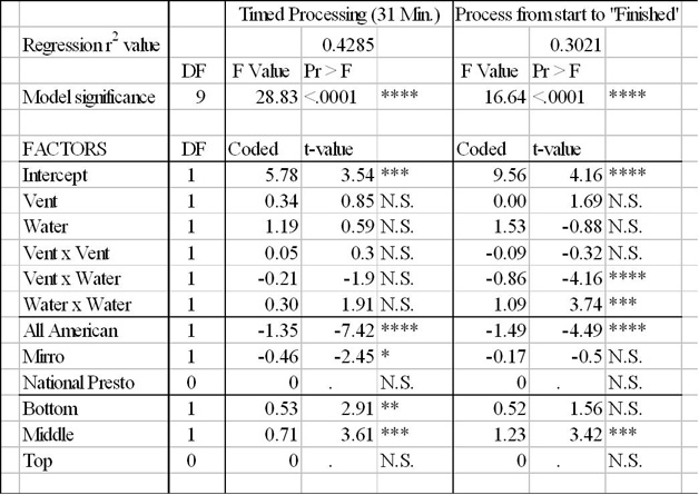 Three-by-three design space factors (venting times and water fill levels) were regressed with the RSREG