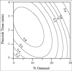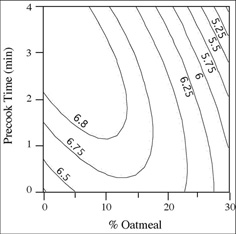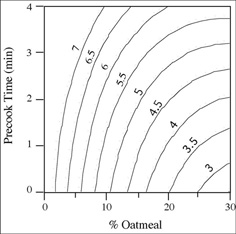 - A maximum value (7.03) was predicted at 3.3% oatmeal level & 3.2 min precook