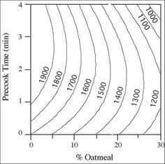 - The response surface showed gradually decreasing values at higher level of oatmeal & shorter precook time