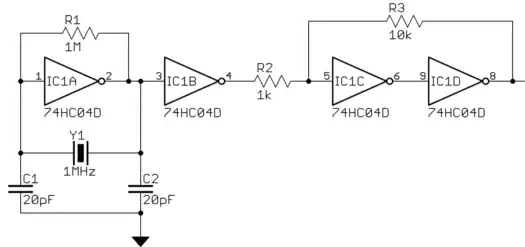 Note also that this circuit requires a parallel resonant crystal. This means its frequency is specified where the phase shift is right for feedback around a amplifier with negative gain. A series resonant crystal will work but the frequency will be off a little.