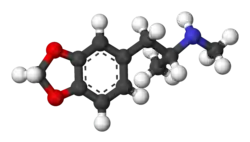 In addition to its actions as an SNDRA, MDMA has weak affinity for the serotonin 5-HT2A, 5-HT2B, and 5-HT2C receptors, where it acts as an agonist.[3] (R)-MDMA shows higher affinity for the serotonin 5-HT2A receptor than (S)-MDMA or MDMA.[3] In addition, (R)-MDMA is more potent as an agonist of the serotonin 5-HT2A receptor, acting as a weak partial agonist of this receptor, whereas (S)-MDMA shows very little effect.[3] Conversely however, (S)-MDMA is more potent as an agonist of the serotonin 5-HT2C receptor.[3][21] Based on these findings, it has been hypothesized that (R)-MDMA may be more psychedelic-like than (S)-MDMA.[2] However, although (R)-MDMA partially substitutes for lysergic acid diethylamide (LSD) in animal drug discrimination tests, it did not produce the head-twitch response, a behavioral proxy of psychedelic effects, at any tested dose.[22] In any case, findings in this area are conflicting.[23] (R)-MDMA is inactive as an agonist of the human TAAR1, whereas (S)-MDMA shows very weak potency as an agonist of the receptor (EC50Tooltip half-maximal effective concentration = 74,000 nM).[24]