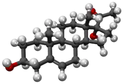 17α-Hydroxypregnenolone is a pregnane (C21) steroid that is obtained by hydroxylation of pregnenolone at the C17α position. This step is performed by the mitochondrial cytochrome P450 enzyme 17α-hydroxylase (CYP17A1) that is present in the adrenal and gonads. Peak levels are reached in humans at the end of puberty and then decline.[1] High levels are also achieved during pregnancy. It is also a known neuromodulator.