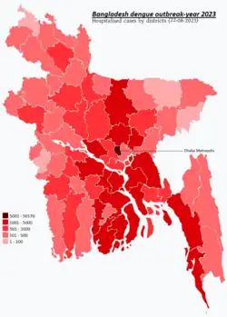 In Bangladesh's ongoing 2023 dengue epidemic season, the country has been witnessing the deadliest outbreak of dengue fever ever since the first outbreak in Bangladesh in 2000.[1][2][3] As of 31 December 2023, the Directorate General of Health Services (DGHS) has reported 321,179 hospitalizations and 1,705 deaths due to the Aedes mosquito-borne tropical disease in the 2023 outbreak year.[4] Like previous years, the outbreak started in Summer (April–May), spread and surged nationwide in the monsoons (July–August).[5] On 3 August, the number of deaths surpassed previous years; and on 21 August, the tally of hospitalization surpassed the previous highest record of the 2019 outbreak.[6] Dhaka is the worst-hit area and the epicentre of the outbreak, with more than half of the cases being reported in the megacity.[7][5] On 25 July, hospitalizations were reported in all districts; and the tally of hospitalizations outside Dhaka city surpassed the figure of the capital on 14 August.