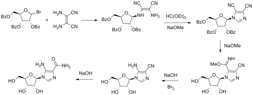 Reaction of 2-bromo tribenzoyl ribose with diaminomaleonitrile results in the displacement of the anomeric halogen by one of the amino groups and the formation of the aminosugar largely as the β-anomer. Treatment of this product with methyl orthoformate in the presence of a base leads to the replacement of the alkoxy groups in orthoformate by the adjacent amines, resulting in the formation of the imidazole ring. Reaction with alkoxide then converts the nitrile nearest the sugar to an iminoester; the benzoyl groups are cleaved in the process. Hofmann rearrangement in the presence of a bromine and a base converts the iminoester to the corresponding primary amine. Basic hydrolysis then converts the remaining nitrile to an amide, affording acadesine.[18]