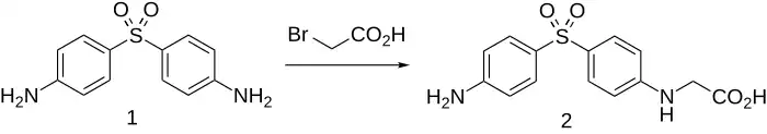 In the search for more easily administered drugs, dapsone (1) was reacted with bromoacetic acid to give acediasulfone (2) which can be administered as a water-soluble salt.