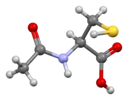 - ^ a b c d e Rind L, Ahmad M, Khan MI, Badruddeen, Akhtar J, Ahmad U, et al. (2022). "An insight on safety, efficacy, and molecular docking study reports of N-acetylcysteine and its compound formulations". Journal of Basic and Clinical Physiology and Pharmacology. 33 (3): 223–233. doi:10.1515/jbcpp-2020-0099. PMID 33638319.
