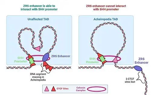 In Acheiropodia, 12,000 letters of DNA are removed, eliminating three CCCTC-binding factor (CTCF) sites.[13] CTCF sites are where CTCF proteins bind. CTCF proteins help organize the genome by forming a topologically associating domain (TAD).[13] TADs are regions of the genome where specific genes and regulatory elements, like enhancers, are grouped together in close physical proximity. The genome is dynamic and spatial organization influences which proteins are produced in the cell. To produce a protein, genes need the help of other genomic regions to become active. These regulatory regions need to be near genes to enable physical interactions and control of protein production. TADs enable frequent interactions of DNA elements within each group, thus assisting with regulating gene expression, an essential developmental process. When the three CTCF sites are present, they help an enhancer called ZRS (zone of polarizing activity regulatory sequence), which is found in intron 5 of the LMBR1 gene, interact with the Sonic Hedgehog (SHH) promoter.[13] SHH is an important protein in limb development.[14] When the ZRS enhancer can interact with the SHH promoter, there is increased expression of the SHH protein. However, in the case of acheiropodia, the 3 CTCF sites are missing, which prevents ZRS from interacting with the SHH promoter.[13] This results in decreased SHH protein production for limb development.[14]