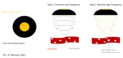 Acoustic angiography is performed by first injecting specially designed microbubbles with a low resonant frequency into the vessels. Next, a low-frequency transducer element with good depth penetration is used to send ultrasound waves into the sample at the resonant frequency of the microbubbles.[3] This will generate a response from the microbubbles consisting of subharmonic, fundamental, and super-harmonic frequencies, as well as a response from the surrounding tissue consisting of only the fundamental and second-harmonic frequencies.[1] Finally, a high-frequency transducer with high resolution is used to measure the super-harmonic frequencies, effectively removing any background signal from the microbubble signal, and allowing the vessels to be visualized[3]