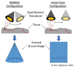 In the wobbler configuration, the probe is rotated back and forth about a central axis in one plane so that the a-scans are radially oriented and the field of view, or region that is able to be imaged, is a cone. This allows for very quick acquisition of a-scans, but has nonhomogeneous resolution as the distance between each point on neighboring a-scans increases with depth.