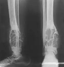 Radiograph showing an adamantinoma in the distal tibia with lytic expansive changes.
