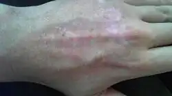 Depending on the duration of exposure aerosol-induced frostbite can vary in depth. Most injuries of this type only affect the epidermis, the outermost layer of skin. However, if contact with the aerosol is prolonged the skin will freeze further and deeper layers of tissue will be affected, causing a more serious burn that reaches the dermis, destroys nerves, and increases the risk of infection and scarring.[6] When the skin thaws, pain and severe discomfort can occur in the affected area.[7] There may be a smell of aerosol products such as deodorant around the affected area, the injury may itch or be painful, the skin may freeze and become hardened, blisters may form on the area, and the flesh can become red and swollen.