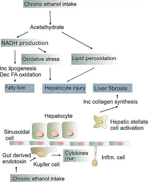 Alcohol is also directly damaging to liver cells. Alcohol is metabolized to acetaldehyde in the liver via the enzymes CYP2E1 and aldehyde dehydrogenase.[7] Acetaldehyde forms reactive oxygen species in the liver as well as acting as a DNA adduct (binding to DNA) leading to direct hepatocyte damage.[7] This manifests as lipid peroxidation, mitochondrial damage, and glutathione (an endogenous antioxidant) depletion.[7] Damaged hepatocytes release Danger associated molecular patterns (DAMPs) which are molecules that lead to further activation of the immune system's inflammatory response and further hepatocyte damage.[7]