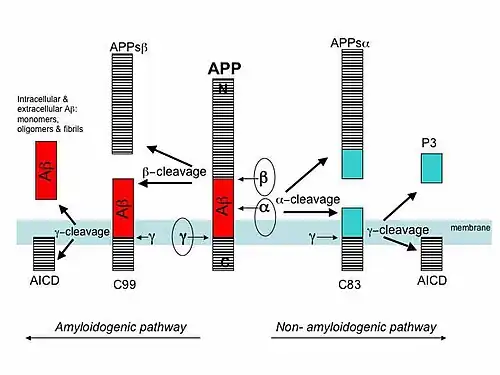 Neuritic plaques and neurofibrillary Tangles (NFTs) are the main pathological component of AD.[7][18] Neuritic plaques are composed mainly of the peptide Aβ, but also include other components.[19] APP is processed through either of two pathways, the first is termed the amyloidogenic pathway and produces Aβ.[19] The second pathway is the non-amyloidogenic pathway and does not produce Aβ.[19] In the amyloidogenic pathway, APP (the parent protein) is trafficked to endosomes, cleaved by beta-secretase (BACE), after which it moves back to the cell surface to be cleaved by gamma secretase thus releasing the Aβ peptide.[7][8][18][19] This form of APP processing produces multiple Aβ peptides, of which Aβ40 and Aβ42 peptide are most abundantly produced.[7][20] APP can also be cleaved by alpha and gamma-secretase and undergo non-amyloidogenic processing.[18][20] NFTs form when the tau protein, which is involved in microtubule stability, is hyperphosphorylated, dissociates from microtubules and then aggregates with other p-tau monomers forming tau oligomers, fibrils and eventually NFTs.[7] These types of pathologies do not differ across ethnic groups.[7]