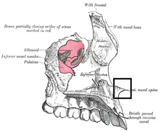 Left maxilla. Nasal surface (anterior nasal spine labeled at bottom right)