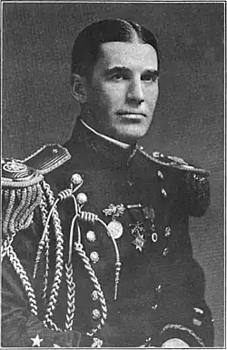 Professor James H. Brewster, a faculty attorney with the University of Colorado who was investigating the strike for Governor Ammons, was aware that militia Lieutenant Karl Linderfelt was guilty of abuse and beatings of innocent citizens, including a small Greek boy "whose head was split open".[38][39] Professor Brewster sent a telegram to Governor Ammons requesting Linderfelt's removal. No action was taken. In a subsequent face to face meeting with the governor, three months prior to the Ludlow Massacre, Brewster again insisted that Linderfelt be removed, but again, Ammons declined. In later testimony, Professor Brewster stated that Linderfelt was the reason for the massacre.[38] On the day that the Ludlow Massacre occurred, Lieutenant Karl Linderfelt, commander of one of two companies of the Colorado National Guard, had Louis Tikas, leader of the Ludlow tent colony of striking miners, at gunpoint. Tikas was unarmed, and the miners would later explain that he approached the militia to ask them to stop shooting.[40] While two militiamen held Tikas, Linderfelt broke a rifle butt over his head. Tikas and two other captured miners were later found shot dead. Tikas had been shot in the back.[41] Their bodies lay along the Colorado and Southern railroad tracks for three days in full view of passing trains. The militia officers refused to allow them to be moved until a local of a railway union demanded the bodies be taken away for burial. A court martial found Lieutenant Linderfelt guilty of assaulting Tikas with a Springfield rifle, "but attaches no criminality thereto. And the court does therefor acquit him."[42]