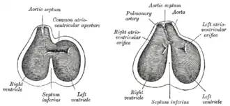 Diagrams to show the development of the septum of the aortic bulb and of the ventricles.