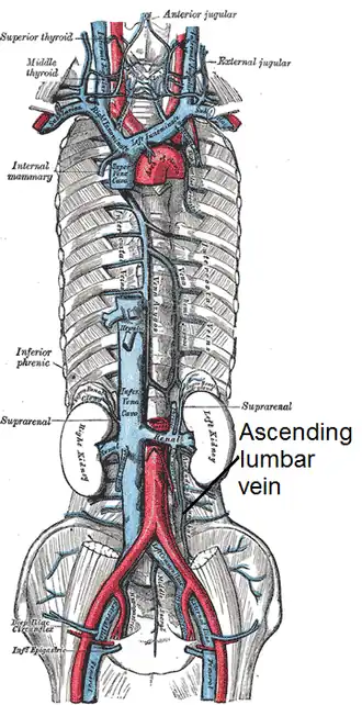 The ascending lumbar vein is a paired structure (i.e. one each for the right and left sides of the body). It starts at the common iliac veins. It runs superiorly, intersecting with the lumbar veins as it crosses them. It passes behind the psoas major muscle, but in front of the lumbar vertebrae.[1]