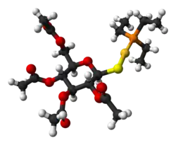 Auranofin is used to treat rheumatoid arthritis. It improves arthritis symptoms including painful or tender and swollen joints and morning stiffness.[4] Auranofin is a safer treatment compared to the more common injectable gold thiolates (gold sodium thiomalate and gold thioglucose), but meta-analysis of 66 clinical trials concluded that it is somewhat less effective.[5]