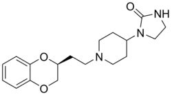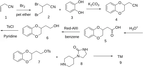 The halogenation of allyl cyanide [109-75-1] (1) with bromine gives 3,4-dibromobutyronitrile [25109-74-4] (2). This is further reacted with catechol [120-80-9] (3) to give the 1,4-benzodioxan-2-yl-acetonitrile [18505-91-4] (4). Acid catalyzed hydrolysis of the nitrile to the acid gives 1,4-benzodioxan-2-yl-acetic acid [18505-92-5] (5). The reduction of this to alcohol with sodium bis(2-methoxyethoxy)aluminium hydride gives 2-(1,4-benzodioxan-2-yl)ethanol [62590-71-0] (6). The tosylation of this intermediate gives CID:12850582 (7). The synthesis concludes with an SN-2 displacement reaction with 1-(4-piperidinyl)-2-imidazolidinone [52210-86-3] (8) completing the synthesis of Azaloxan (9).