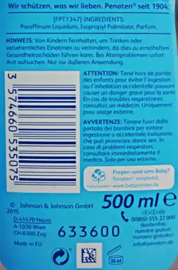 Ingredients of a baby oil product based on mineral oil: liquid paraffins, isopropyl palmitate, and fragrance ("parfum").