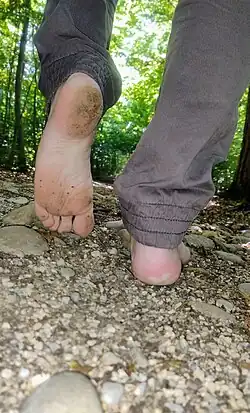 Barefoot hikers claim that they feel a sense of communion with the earth and enjoy the sheer pleasure of feeling more of the world with their feet.[102] There are several clubs throughout North America practicing regular barefoot hikes, including the Barefoot Hikers of Minnesota, Seattle Barefoot Hikers, East Bay Barefoot Hikers, the Barefoot Hikers and Grass Walkers of Greater Kansas City, and the Barefoot Hikers of Connecticut.[102][103][104] This is in part also undertaken to be reminiscent of former slaves, who were often forced to remain barefoot at all times (see above).[105][106] Two sisters, Lucy and Susan Letcher, hiked approximately two-thirds of the 2,175-mile (3,500 km) Appalachian Trail barefoot from June 21, 2000, to October 3, 2001.[107][108] On November 12, 2010, 2,500 people in Mahabubnagar, India, participated in a barefoot walk, which was recognized by Guinness World Records as the world's largest.[109]