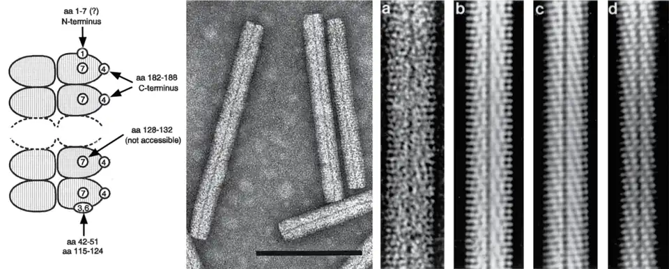 (Left) Scheme showing the accessibility to antibodies of various parts of the coat protein amino acid (aa) sequence in particles of BNYVV. Encircled numbers designate different epitopes. (Center) Negative contrast electron micrograph of stained purified particles of BNYVV. (Right) From left (a) negative contrast electron micrograph of a BNYVV particle and (b, c, d) computer-filtered micrographs of BNYVV particle.
