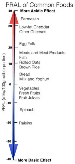 When more sulfur containing amino acids, methionine and cystine, are consumed than the body can use for growth and repair, they are broken down yielding sulfate, or sulfuric acid among other products. Animal foods such as meat, dairy, and eggs are high in protein and "dietary animal protein intake is highly correlated with renal net acid excretion".[10] Research dating back to the early 1900s has shown correlations between high protein diets and increased acid excretion.[11] One measure of the acidic or basic effects foods have in the body is Potential Renal Acid Load (PRAL). Cheeses with protein content of 15 g protein/100g or higher have a high PRAL value of 23.6 mEq/100 g edible portion. Meats, fish, other cheeses and flour or noodles all have a PRAL around 8.0 mEq/100 g edible portion, where fruits and vegetables actually have a negative PRAL.[5][12]