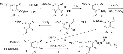 The treatment of Dimethyl 2,6-dimethoxybenzene-1,4-dicarboxylate [16849-68-6] (1) with hydroxylamine in PPA gives the hydroxamide, PC12398304 (2). Further treatment with PPA led to methyl 4-amino-3,5-dimethoxybenzoate [56066-25-2] (3). Sandmeyer reaction led to Methyl 4-bromo-3,5-dimethoxybenzoate [26050-64-6] (4). Saponification of the ester formed 4-Bromo-3,5-dimethoxybenzoic acid [56518-42-4] (5). Halogenation with thionyl chloride gave 4-Bromo-3,5-dimethoxybenzoyl chloride [56518-43-5] (6). Rosenmund reduction gave 4-Bromo-3,5-dimethoxybenzaldehyde [31558-40-4] (7). {Alternatively DIBAL meant that FGI from ester to aldehyde was accomplished in only 1 step}. Knoevenagel condensation with 3-Methoxypropionitrile [110-67-8] (8) afforded [56518-39-9] (9). Finally, condensation with Guanidine [113-00-8] completed the synthesis of Brodimoprim (10).