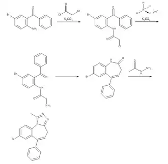 Subsequently, through the aid of acetohydrazide, another acylation event takes place, giving rise to a 1,2,4-triazole ring and ultimately yielding bromazolam.[14][17][18][19] This synthesis can also be used to obtain alprazolam by using 2-amino-5-chlorobenzophenone as the starting material.