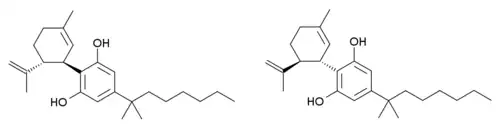 - ^ Hanus LO, Tchilibon S, Ponde DE, Breuer A, Fride E, Mechoulam R (March 2005). "Enantiomeric cannabidiol derivatives: synthesis and binding to cannabinoid receptors". Organic & Biomolecular Chemistry. 3 (6): 1116–23. doi:10.1039/B416943C. PMID 15750656.