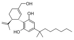 Another closely analogous compound has also been described, with the double bond in the cyclohexene ring shifted to between the 1,6-positions rather than the 2,3-positions (i.e. analogous to synthetic THC analogues such as parahexyl), the isopropenyl group saturated to isopropyl, and a 1,2-dimethylheptyl side chain. It is synthesized by Birch reduction from the 1,2-dimethylheptyl analogue of cannabidiol. This compound also produces potent cannabinoid-like effects in animals, but has three chiral centers and is composed of a mixture of eight stereoisomers, which have not been studied individually, so it is not known which stereoisomers are active.[7][8]
