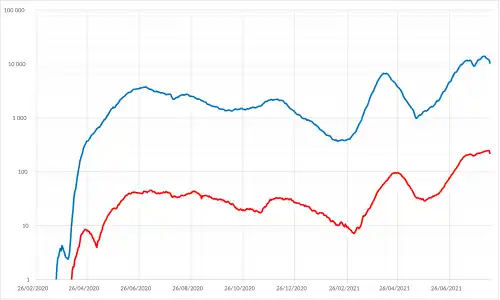 Throughout the first half of July, Bangladesh regularly recorded its highest daily deaths since the pandemic began[76][77][78][79][80] as hospitals struggled under the strain, with many operating above their capacity.[81]