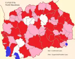 The COVID-19 pandemic in North Macedonia was a part of the ongoing worldwide pandemic of coronavirus disease 2019 (COVID-19) caused by severe acute respiratory syndrome coronavirus 2 (SARS-CoV-2). The virus was confirmed to have reached North Macedonia in February 2020.[3] The initial contagion in the country was mainly connected with the COVID-19 pandemic in Italy as there are circa 70,000 residents[4] of Italy from North Macedonia and resulted in many people returning to North Macedonia, bringing the virus with them.[5] As of 9 July, over 7,000 cases have been confirmed in the country, due to its second wave caused by family reunions during Eid al-Fitr among the Muslim minority and the overall re-opening of the country to organize the parliamentary elections.[6][7][8]