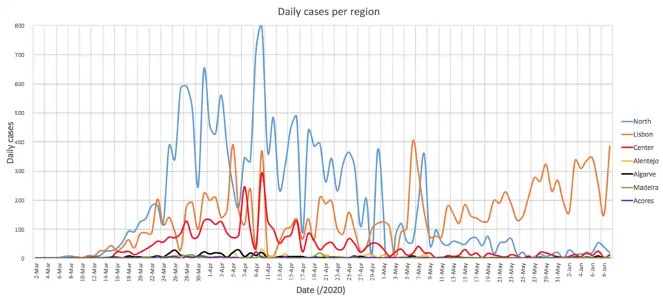 The following graph shows the daily cases of COVID-19 for each region of Portugal (updated on the 10th of June) according to DGS[58] visualising the table above.