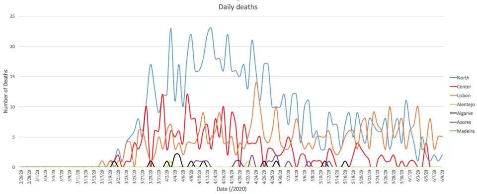 Similarly, the following graph presents the daily deaths by COVID-19 for each region of Portugal (updated on the 10th of June) according to DGS.[69]