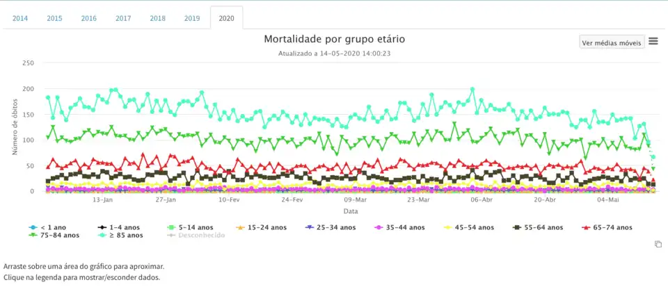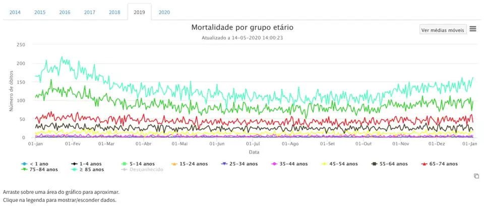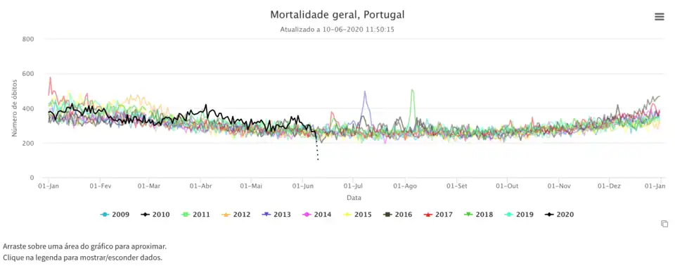 According to the Portuguese mortality surveillance (EVM[71]), the following chart presents the total number of deaths per day in Portugal for the years 2009–2020 (updated on 10 June).
