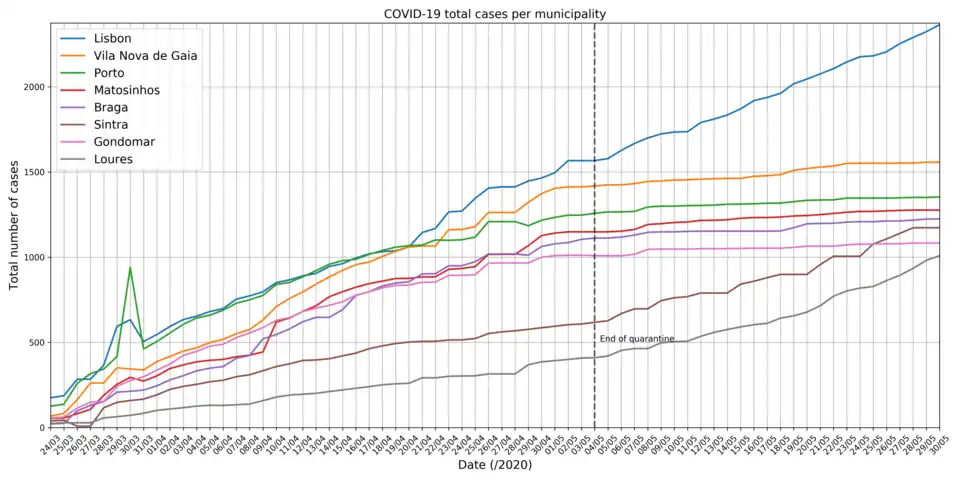 The following graph presents the total number of COVID-19 cases per day for the municipalities of Portugal with more than 1000 confirmed cases (updated on 30 May), according to the Data Science for Social Good Portugal.[70]