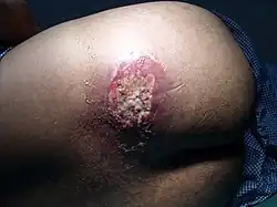 A carbuncle is a cluster of boils caused by bacterial infection, most commonly with Staphylococcus aureus or Streptococcus pyogenes.[1] The presence of a carbuncle is a sign that the immune system is active and fighting the infection.[2] The infection is contagious and may spread to other areas of the body, or other people; those living in the same residence may develop carbuncles at the same time.[3] In the early 21st century, infection involving methicillin-resistant Staphylococcus aureus (MRSA) has become more common.[4]