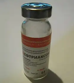 Ceftriaxone, sold under the brand name Rocephin, is a third-generation cephalosporin antibiotic used for the treatment of a number of bacterial infections.[4] These include middle ear infections, endocarditis, meningitis, pneumonia, bone and joint infections, intra-abdominal infections, skin infections, urinary tract infections, gonorrhea, and pelvic inflammatory disease.[4] It is also sometimes used before surgery and following a bite wound to try to prevent infection.[4] Ceftriaxone can be given by injection into a vein or into a muscle.[4]