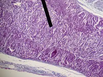 The carotid body is a group of chemoreceptor cells located at the bifurcation of the common carotid artery. It includes two populations of cells; glomus (type I) cells and sustentacular (type II) cells. Glomus cells are derived from the neural crest and secrete dopamine in response to hypoxemia (low level of oxygen in the blood).[10] Based on their ability to secrete dopamine and also glial cell-derived neurotrophic factor (GDNF),[11] these cells have been investigated as an intrastriatal autograft therapy for patients with Parkinson's disease.[12][13] A clinical trial exploring this initially demonstrated motor benefits, unfortunately these benefits disappeared after 6–12 months, in correlation with poor survival of the grafted cells.[14]