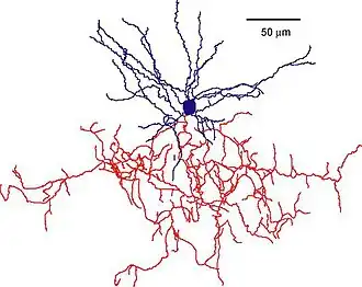 Reconstruction of a mouse chandelier cell. Soma and dendrites are labeled in blue, axon arbor in red. (Woodruff & Yuste, 2008, PLoS Biology)[1]