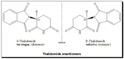 57. ^ Eriksson, Tommy; Bjöurkman, Sven; Roth, Bodil; Fyge, Årsa; Höuglund, Peter (1995). "Stereospecific determination, chiral inversion in vitro and pharmacokinetics in humans of the enantiomers of thalidomide: KINETICS OF THE ENANTIOMERS OF THALIDOMIDE". Chirality. 7 (1): 44–52. doi:10.1002/chir.530070109. PMID 7702998.
