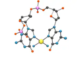 Most notable among the changes in DNA are the 1,2-intrastrand cross-links with purine bases. These include 1,2-intrastrand d(GpG) adducts, which form nearly 90% of the adducts, and the less common 1,2-intrastrand d(ApG) adducts. Coordination chemists have obtained crystals of the products of reacting cisplain with small models of DNA. Here is a POVray plot of the platinum binding to a small model of DNA.[26]