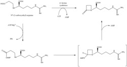 β-lactam synthetase is a 54.5 kDa protein that is encoded by orf3 of the clavulanic acid gene cluster, and shows similarity to asparagine synthase – Class B enzymes. The exact mechanism on how this enzyme works to synthesize the β-lactam is not proven, but is believed to occur in coordination with a CEA synthase and ATP.[13]