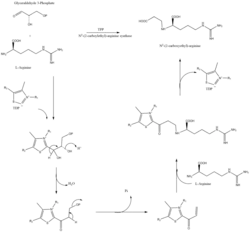 The β-lactam like structure of clavulanic acid looks structurally similar to penicillin, but the biosynthesis of this molecule involves a different biochemical pathway. Clavulanic acid is produced by the bacterium Streptomyces clavuligerus, using glyceraldehyde-3-phosphate and L-arginine as starting materials.[10][11] Although each of the intermediates of the pathway is known, the exact mechanism for all of the enzymatic reactions is not fully understood. The process mainly involves 3 enzymes: clavaminate synthase, β-lactam synthetase, and N2-(2-carboxyethyl)-L-arginine (CEA) synthase.[10] Clavaminate synthase is a non-heme oxygenase dependent on iron and α-keto-glutarate and is encoded by orf5 of the clavulanic acid gene cluster. The specific mechanism of how this enzyme works is not fully understood, but this enzyme regulates 3 steps in the overall synthesis of clavulanic acid. All 3 steps occur in the same region of the catalytic, iron-containing reaction center, yet do not occur in sequence and affect different areas of the clavulanic acid structure.[12]