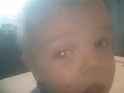 The most common sign at presentation is leukocoria (abnormal white reflection of the retina).[2] Symptoms typically begin as blurred vision, usually pronounced when one eye is closed (due to the unilateral nature of the disease). Often the unaffected eye will compensate for the loss of vision in the other eye; however, this results in some loss of depth perception and parallax. Deterioration of sight may begin in either the central or peripheral vision. Deterioration is likely to begin in the upper part of the vision field as this corresponds with the bottom of the eye where blood usually pools. Flashes of light, known as photopsia, and floaters are common symptoms. Persistent color patterns may also be perceived in the affected eye. Initially, these may be mistaken for psychological hallucinations, but are actually the result of both retinal detachment and foreign fluids mechanically interacting with the photoreceptors located on the retina.